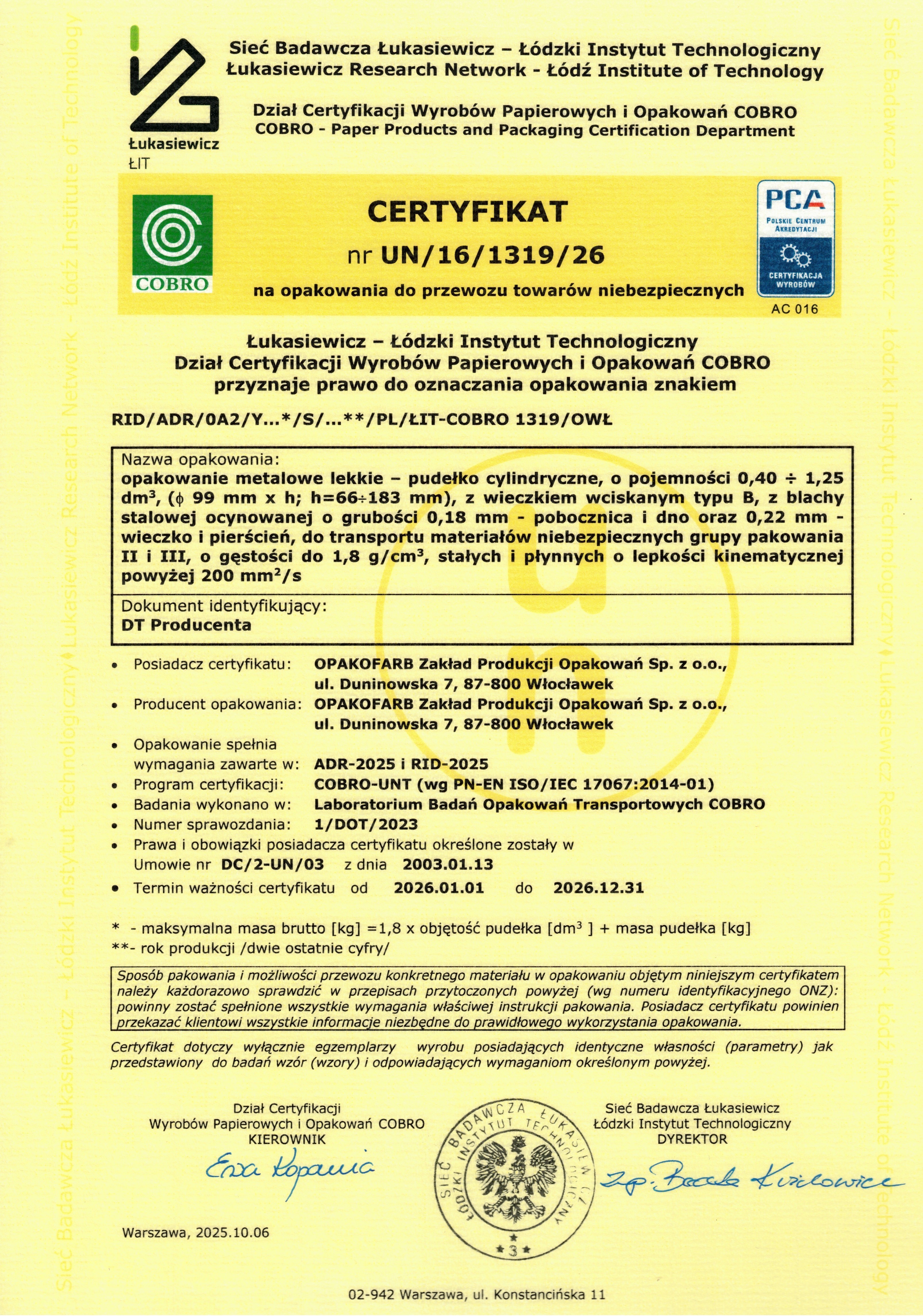 Certyfikat na opakowanie