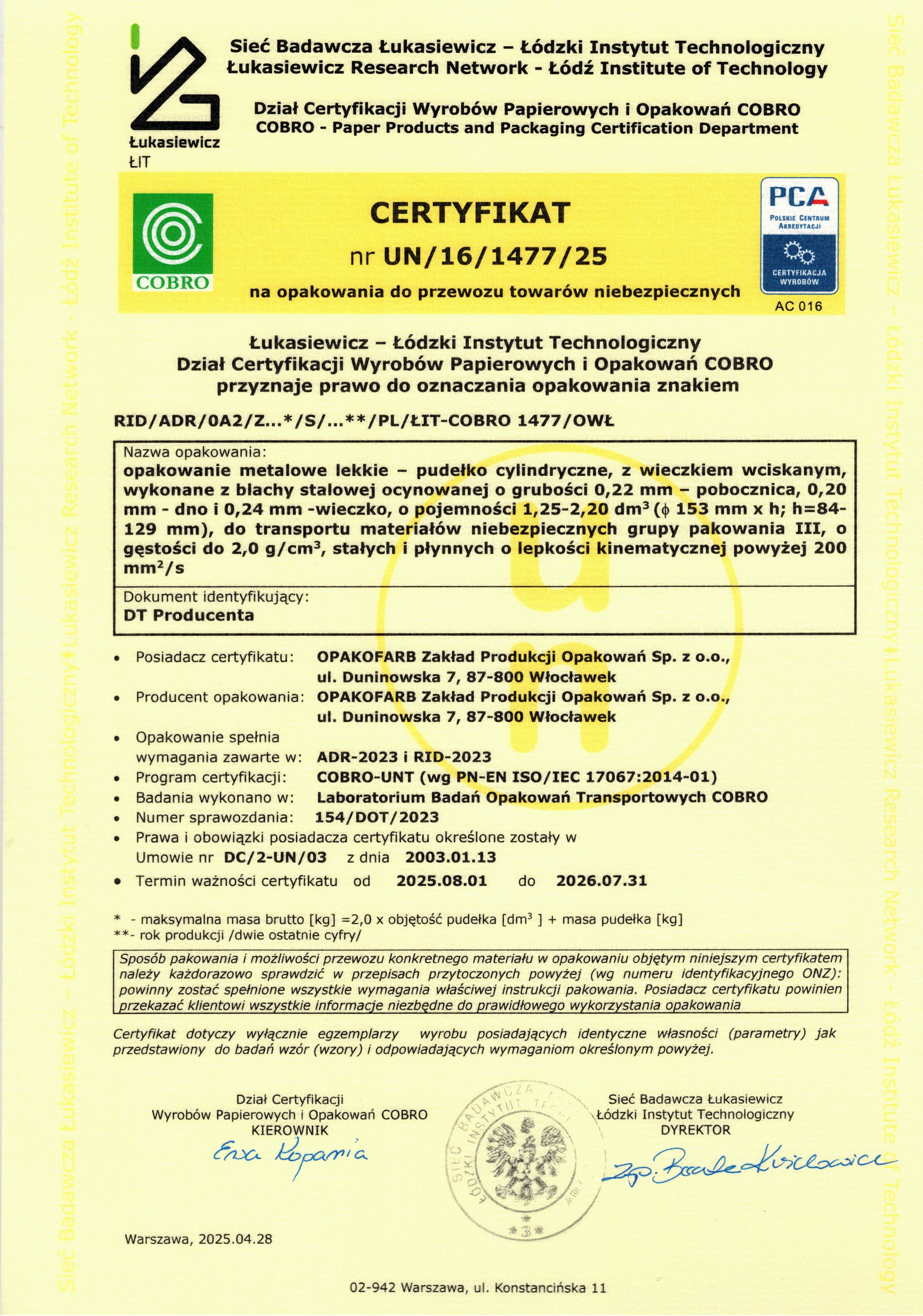 Na życzenie zamawiającego pudełko może posiadać zabezpieczenie powierzchni pod wyroby wodorozcieńczalne. Pudełka mogą mieć wytłoczony na pobocznicy trójkąt - znak ostrzegawczy przed substancjami niebezpiecznymi.