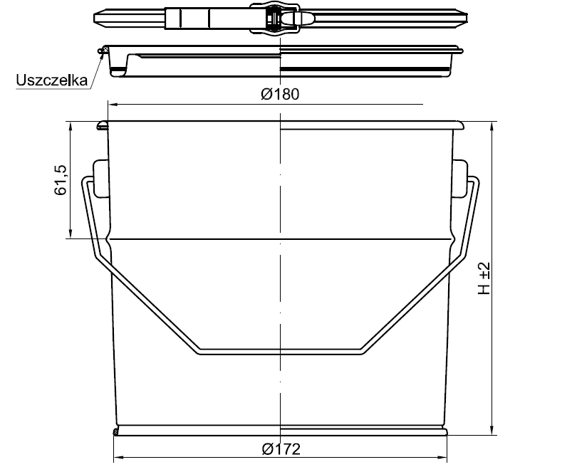 Wiadro wykonane jest z blachy ocynowanej. Zamknięte wiekiem nakładanym, połączonym z pobocznicą pierścieniem z zaciskiem dźwigniowym zabezpieczonym przed otwarciem plombą. Uszczelnienie wieka wykonane jest z masy uszczelniającej. Zawalcowanie dna z pobocznicą uszczelnione jest uszczelką z masy uszczelniającej. Dla wiader o pojemności od 2,5 l do 7,0 l kabłąk wykonany jest z drutu ocynkowanego Ø 2,7 mm; dla wiader o pojemności od 10,0 l do 20,0 l kabłąk wykonany jest z drutu ocynkowanego Ø 3,9 mm z uchwytem z tworzywa sztucznego. Na życzenie zamawiającego wiadra o pojemności 2,5L - 5L oraz 10L -12L mogą być wykonane w wersji z przetłoczeniem pobocznicy lub bez przetłoczenia pobocznicy. Wiadro może posiadać zabezpieczenie powierzchni pod wyroby wodorozcieńczalne. Wszystkie typy wiader mogą mieć wytłoczony na pobocznicy trójkąt - znak ostrzegawczy przed substancjami niebezpiecznymi.